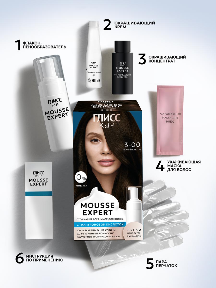 Окрашивающий концентрат: Aqua (Water, Eau) · Ethanolamine · Toluene-2,5-Diamine Sulfate · Cocamidopropyl Betaine · Resorcinol · Glycerin · Sodium Chloride · m-Aminophenol · PEG-40 Hydrogenated Castor Oil · Potassium Hydroxide · Parfum (Fragrance) · Serine · Sodium Sulfite · Bis-Aminopropyl Diglycol Dimaleate · 2-Amino-4-Hydroxyethylaminoanisole Sulfate · Etidronic Acid · Ascorbic Acid · Citronellol · Alpha-Isomethyl Ionone · Coumarin. Проявляющая эссенция: Aqua (Water, Eau) · Hydrogen Peroxide · Coco-Glucoside · Caprylyl/Capryl Glucoside · Phosphoric Acid · Etidronic Acid · Disodium Pyrophosphate · 2,6-Dicarboxypyridine · Potassium Hydroxide · Sodium Benzoate. Ухаживающая маска: Aqua (Water, Eau) · Cetearyl Alcohol · Phenyl Trimethicone · Cetyl Alcohol · Behentrimonium Methosulfate · Phenoxyethanol · Parfum (Fragrance) · Magnesium Chloride · Panthenol · Hydrolyzed Keratin · Ethylhexylglycerin · Citric Acid · Prunus Armeniaca (Apricot) Kernel Oil · Argania Spinosa Kernel Oil · Pantolactone · Cyclomethicone · Potassium Sorbate · Dimethylsilanol Hyaluronate · Hexyl Cinnamal · Limonene · Linalool · Geraniol · Citronellol · Alpha-Isomethyl Ionone · Coumarin.
