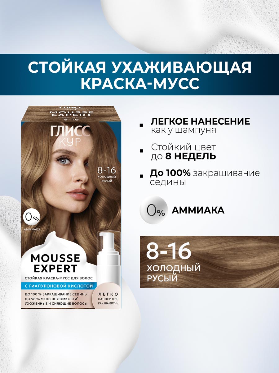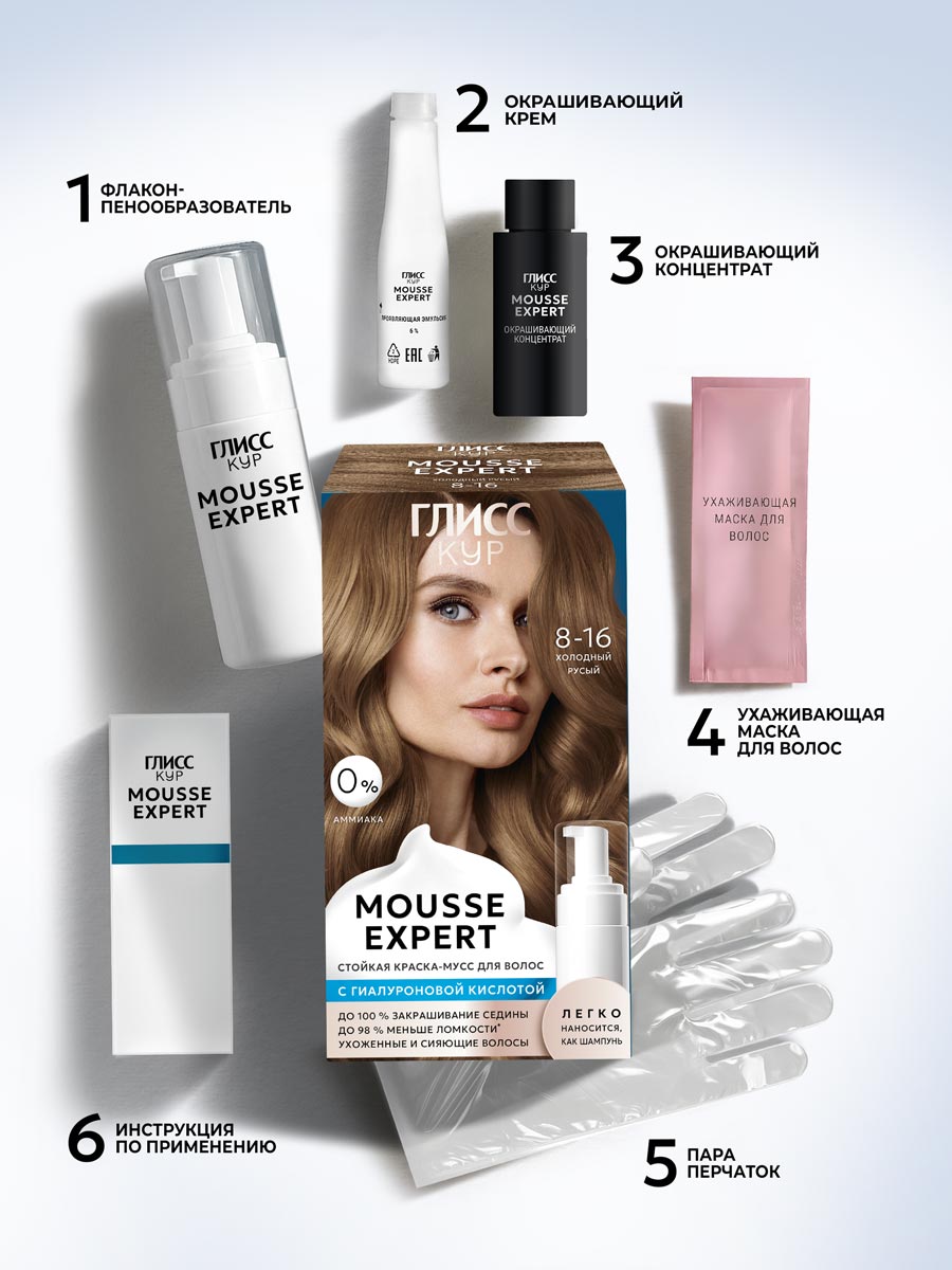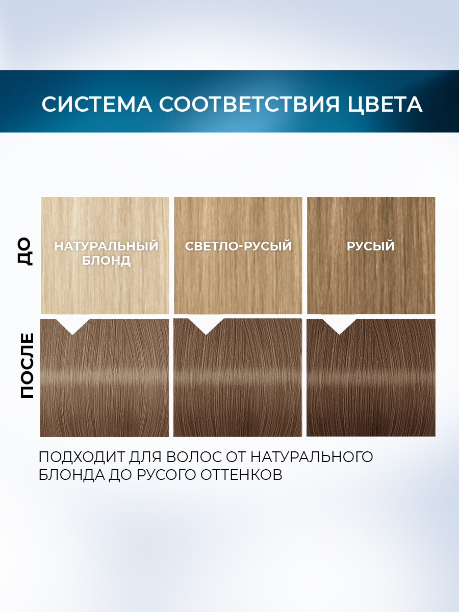 Окрашивающий концентрат: Aqua (Water, Eau) · Ethanolamine · Cocamidopropyl Betaine · Glycerin · Toluene-2,5-Diamine Sulfate · Sodium Chloride · PEG-40 Hydrogenated Castor Oil · Parfum (Fragrance) · Serine · Resorcinol · Sodium Sulfite · Bis-Aminopropyl Diglycol Dimaleate · Etidronic Acid · Potassium Hydroxide · 2-Methylresorcinol · Ascorbic Acid · m-Aminophenol · 2-Amino-4-Hydroxyethylaminoanisole Sulfate · 2-Amino-3-Hydroxypyridine · Citronellol · Alpha-Isomethyl Ionone · Coumarin. Проявляющая эссенция: Aqua (Water, Eau) · Hydrogen Peroxide · Coco-Glucoside · Caprylyl/Capryl Glucoside · Phosphoric Acid · Etidronic Acid · Disodium Pyrophosphate · 2,6-Dicarboxypyridine · Potassium Hydroxide · Sodium Benzoate. Ухаживающая маска: Aqua (Water, Eau) · Cetearyl Alcohol · Phenyl Trimethicone · Cetyl Alcohol · Behentrimonium Methosulfate · Phenoxyethanol · Parfum (Fragrance) · Magnesium Chloride · Panthenol · Hydrolyzed Keratin · Ethylhexylglycerin · Citric Acid · Prunus Armeniaca (Apricot) Kernel Oil · Argania Spinosa Kernel Oil · Pantolactone · Cyclomethicone · Potassium Sorbate · Dimethylsilanol Hyaluronate · Hexyl Cinnamal · Limonene · Linalool · Geraniol · Citronellol · Alpha-Isomethyl Ionone · Coumarin.